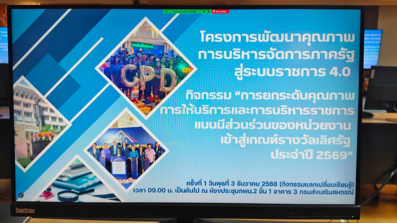 วันพุธที่ 3 ธันวาคม 2568 นางสาวพักตร์พิมล สุวรรณโณ ผู้อำนวยการกลุ่มพัฒนาระบบบริหาร เป็นประธานในพิธีเปิดโครงการพัฒนาคุณภาพการบริหารจัดการภาครัฐ สู่ระบบราชการ 4.0 กิจกรรม "การยกระดับคุณภาพการให้บริการและการบริหารราชการแบบมีส่วนร่วมของหน่วยงานเข้าสู่เกณฑ์รางวัลเลิศรัฐ ประจำปี 2569" โดยมีวัตถุประสงค์ เพื่อสร้างความรู้ ความเข้าใจเกี่ยวกับหลักเกณฑ์การพิจารณารางวัลเลิศรัฐ แนวทางการจัดทำใบสมัครและเพื่อเป็นการแลกเปลี่ยนเรียนรู้ของบุคลากร โดยได้รับเกียรติจากนายวีรภัทร เณรศาสตร์ สหกรณ์จังหวัดสุโขทัย เป็นวิทยากรบรรยายการถอดบทเรียนแนวทางการขับเคลื่อนเพื่อยกระดับคุณภาพการบริการ การบริหารราชการแบบมีส่วนร่วมของหน่วยงานเข้าสู่เกณฑ์รางวัลเลิศรัฐ และได้รับเกียรติจากนายสุรินทร์ วทัญญู ผู้อำนวยการศูนย์เทคโนโลยีสารสนเทศและการสื่อสาร ผู้แทนคณะทํางานขับเคลื่อนการพัฒนาประสิทธิภาพการให้บริการ การบริหารราชการแบบมีส่วนร่วม และการบริหารจัดการภาครัฐ ให้คำแนะนำการส่งผลงานสมัครเข้ารับรางวัลเลิศรัฐ ประจำปี พ.ศ. 2569 ณ ห้องประชุม กพน. 2 อาคาร 3 ชั้น 1 กรมส่งเสริมสหกรณ์ เวลา 09.00 - 12.00 น. และถ่ายทอดสัญญาณผ่านระบบ Zoom Meeting ไปยังหน่วยงานส่วนกลางและส่วนภูมิภาค